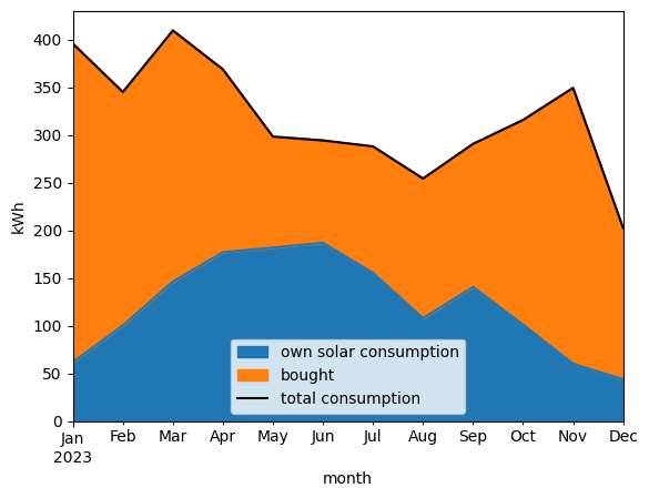 Once the hard part is out of the way, the interesting part begins. By subtracting the injected energy from the total solar panel output, you can find out how much of your own solar power you consume yourself. Add that to the energy you got from the grid, and you know how much you consumed in total. All of this is easily done in pandas. I won’t put all of the code here because it’s rather straighforward but probably too specific for my case to be useful. But if you’re interested, reach out to me and I’ll happily share it.